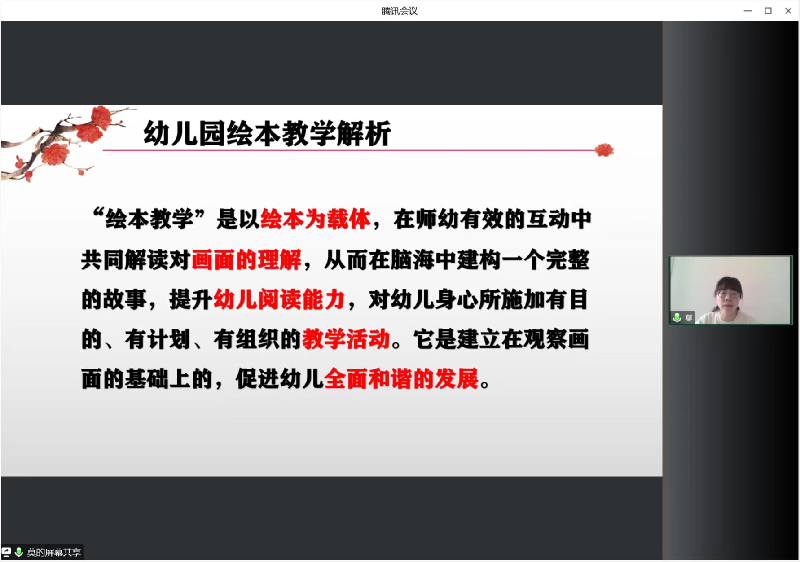 2022年12月15日,徐泾幼儿园见习规培基地开展了2022学年见习教师规范化培训的第八次集中培训,本次活动以腾讯会议的方式进行。培训由见习教师规培基地工作管理负责人龚盛妍老师主持本次活动,徐幼基地11名2022学年见习教师参与了本次活动。本次培训主要围绕《幼儿园绘本教学解析》展开,崇华幼儿园莫春流园长为见习教师深度讲解幼儿园里绘本教学的那些事。
