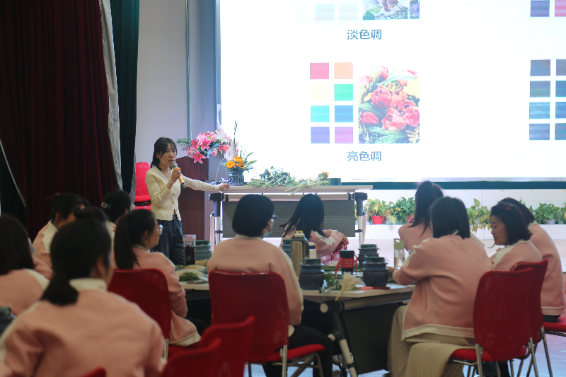 花艺师张老师细致讲解了各类花型和不同插花形式所表达的意境,现场演示了插花的基本方法,并讲授了各种花卉所蕴含的花语和祝福。
