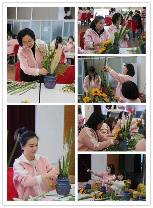 老师们一边认真聆听,一边拿起花枝动手修剪,大家从层次搭配、色彩点缀、设计造型中学习了简单的插花技巧。不同色彩的鲜花汇聚、成型、定格,花香四溢,欢声笑语,大家在插花中寻找乐趣,从作品中获得满足,在交流中拉近距离。