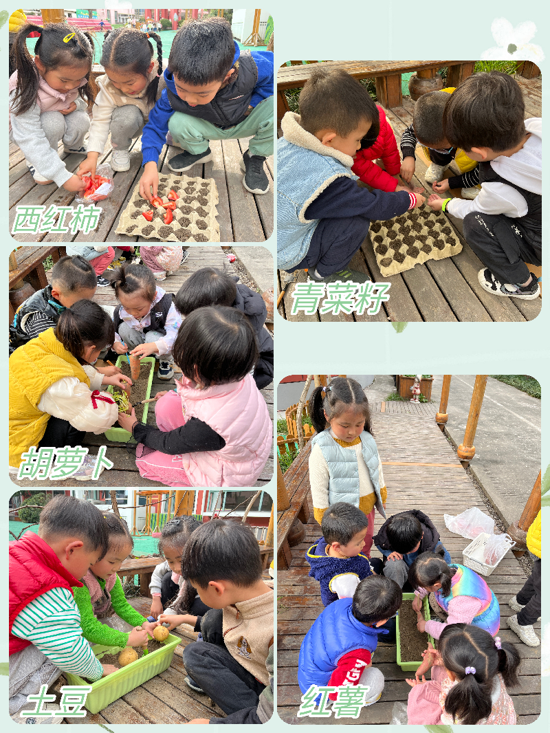 孩子们拿上铲子、浇水壶等工具,在班级自然角,在户外种植区,在校园的空地上……挖土、播种、浇水,大家用双手共植一片绿,让绿色散满整个校园。