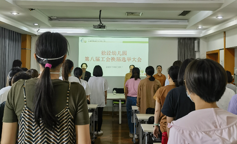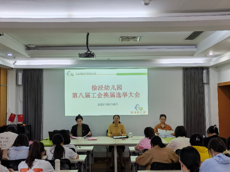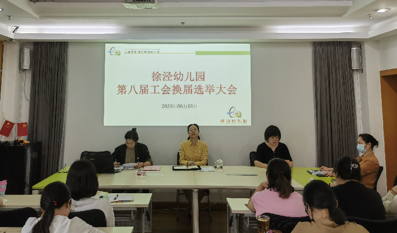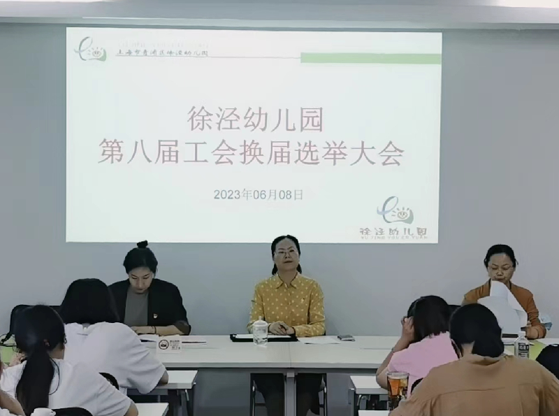 2023年6月8日中午,徐泾幼儿园第八届工会委员会选举大会在第二会议室召开,支部委员黄小春老师主持会议,会议在庄严的国歌声中拉开了序幕。