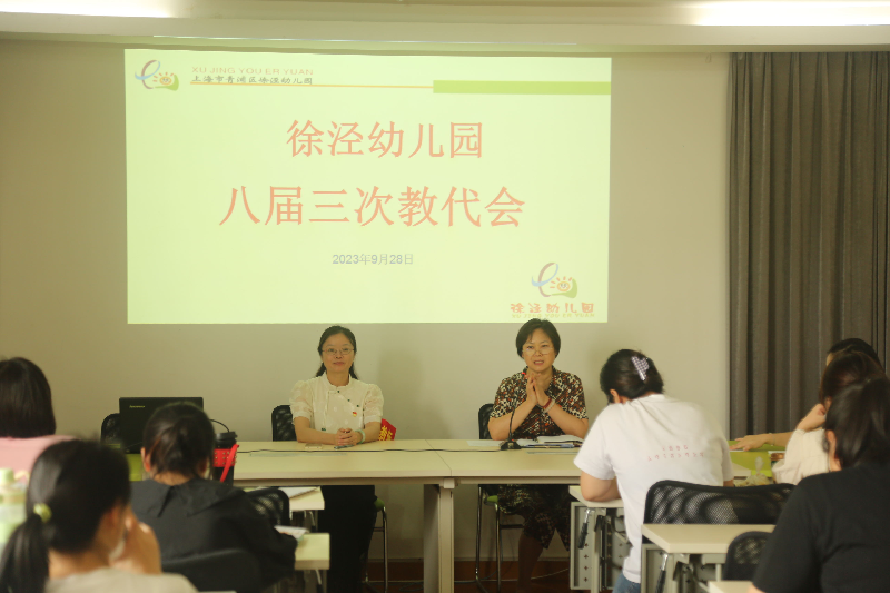 为进一步加强徐泾幼儿园的制度建设及民主建设,发挥教职工代表大会的职能作用,让教职工积极参与到幼儿园管理中,为学校发展献言献策,2023年9月28日中午,徐泾幼儿园第八届教职工代表大会第三次会议在综合楼三楼会议室召开。会议由工会主席沈利群老师主持。