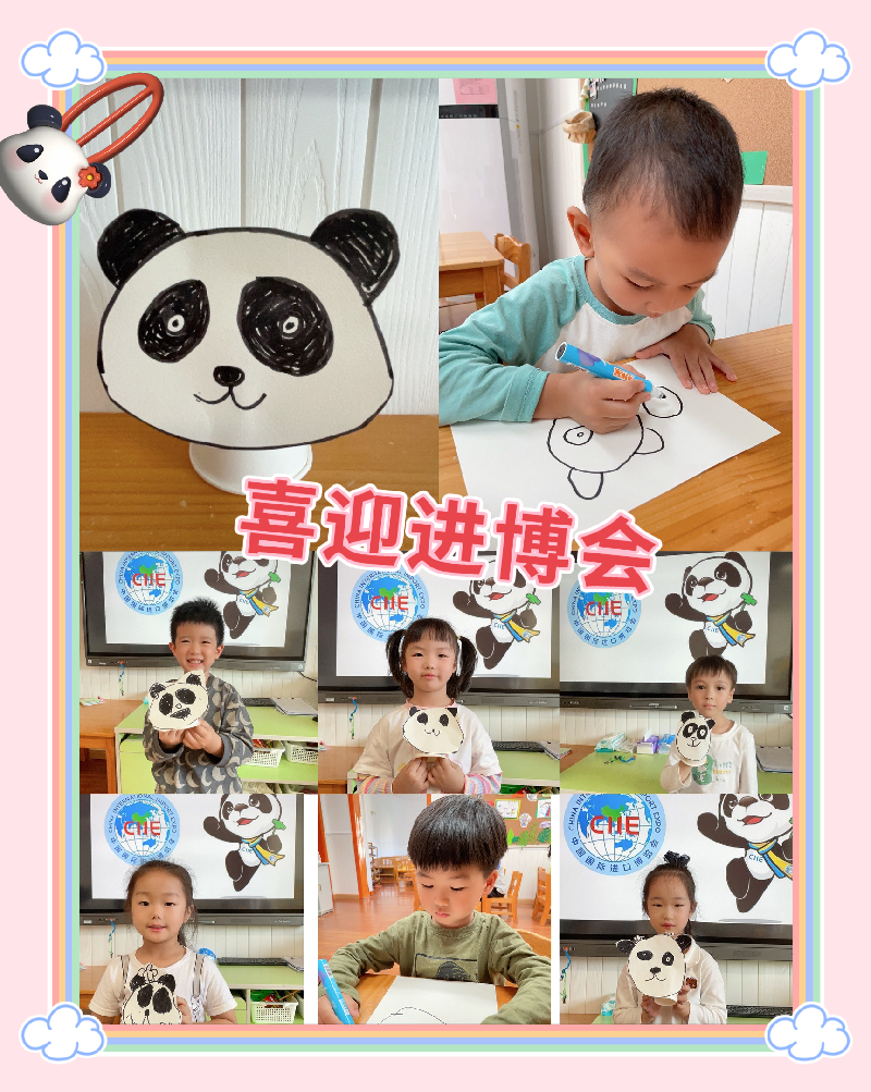 “进宝”的主体形象是一只可爱的“国宝”大熊猫,取名“进宝”,既有“进口博览会之宝”的含义,也是 “进博”的谐音,还暗含着“招财进宝”的吉祥寓意。徐幼萌娃的巧手,绘制出了一个个可爱的进宝。班级老师带着幼儿认识进宝,了解进宝。