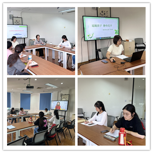 徐泾幼儿园许彩萍老师开展题为“追随孩子,静待花开”的讲座,讲座开始,徐泾幼儿园许彩萍老师向见习老师们介绍了一位全国教书育人的楷模——孙怡老师,在观看孙怡老师的访谈视频中,每位老师都能够从孙怡老师的双重身份中感受到沉甸甸的重量。孙怡老师既是一位每天和孩子们朝夕相处的一线老师,同时也是一位楷模老师,这样的双重身份让孙怡老师在教师这个岗位上付出了比别人更多的时间和精力。见习教师们在孙怡老师的从教经历中学习到,如何做一名教师,同时也被孙怡老师对于如何做一名楷模的见解所激励。视频结束后,见习教师们发表了自己的看法,许彩萍老师做出了相应的总结。其次,许老师向见习教师们介绍了一位身边的楷模,那就是徐泾幼儿园四有五美教师——谢建权老师。谢建权老师做为幼儿园里的一名男老师,对待孩子既细心又耐心,总是将一些新奇有趣的内容引进到自己的课堂中来,并且将自己对于科学、运动方面课程内容的想法都呈现在班级版面的创设当中。在谢建权老师的任教时间内,不仅消除了家长对于男教师的不信任,还获得了家长的一致好评。接着,徐泾幼儿园许彩萍老师向见习教师们强调了幼儿园教师的行为准则,向见习教师解读《专业标准》中的四个基本理念;带领见习教师一起朗读《新时代幼儿园教师职业行为十项准则》;向新教师提出熟悉并遵守学前教育相关法律和政策法规的相关要求。