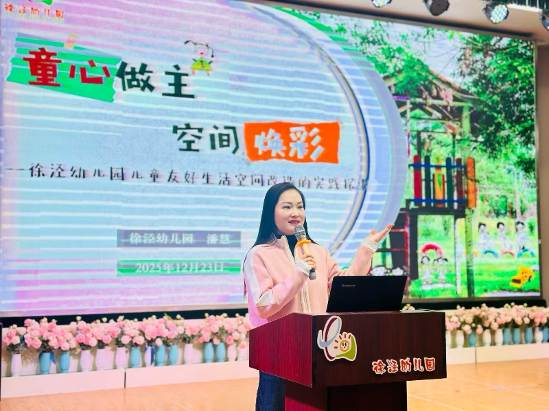 活动伊始,徐泾幼儿园潘老师以《童心做主 空间焕彩——徐泾幼儿园儿童友好生活空间改造的实践探索》为题作经验汇报,分享了幼儿园在空间改造中的创新举措与实践成果。